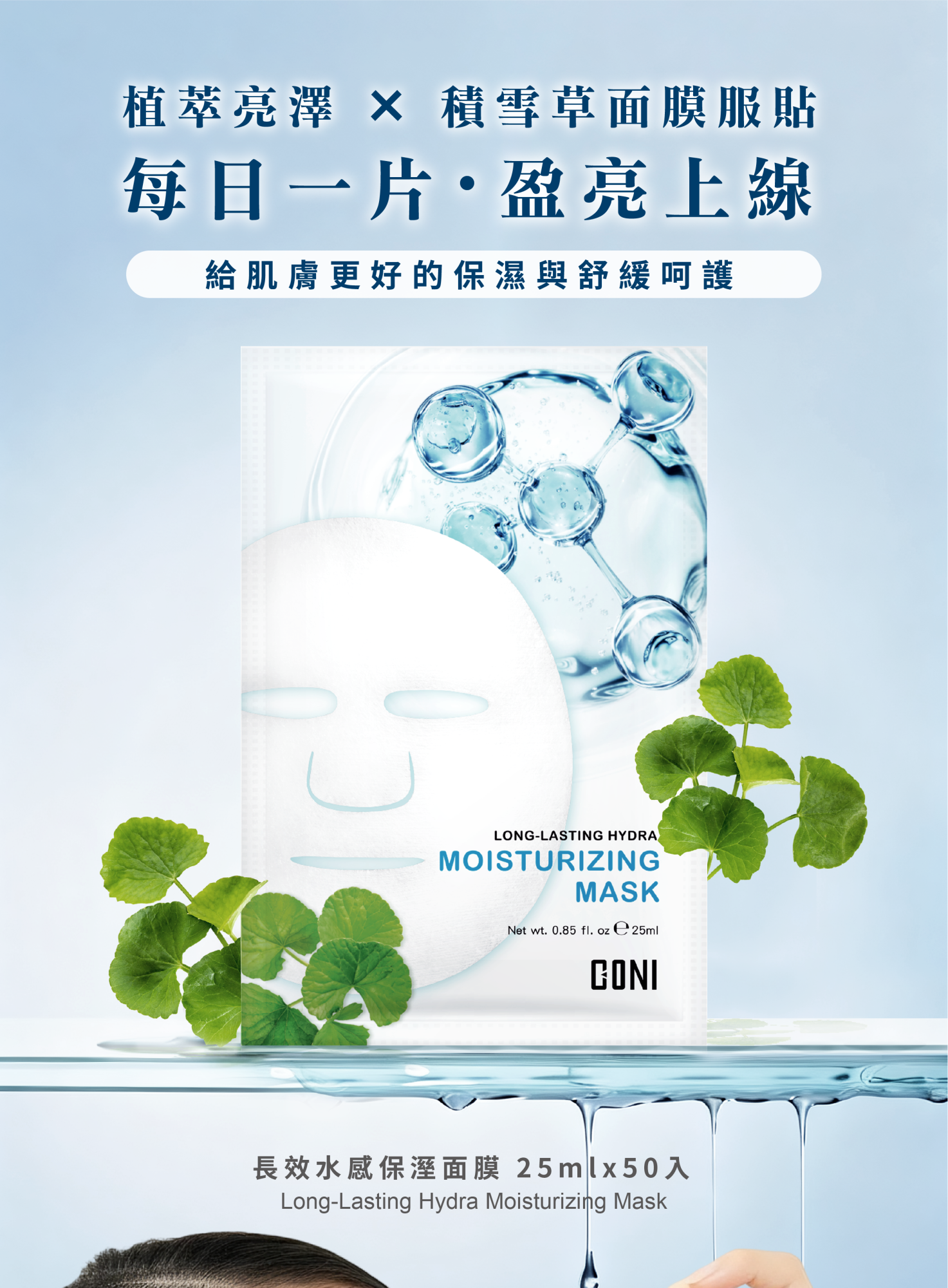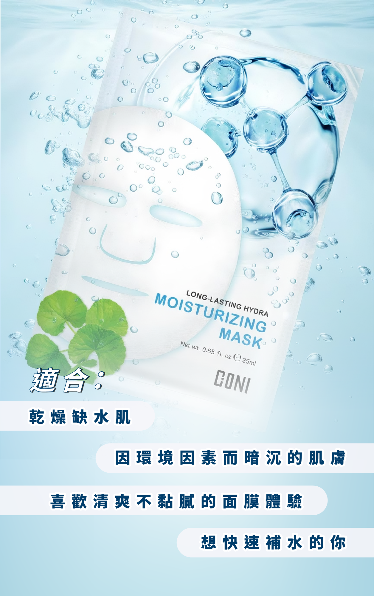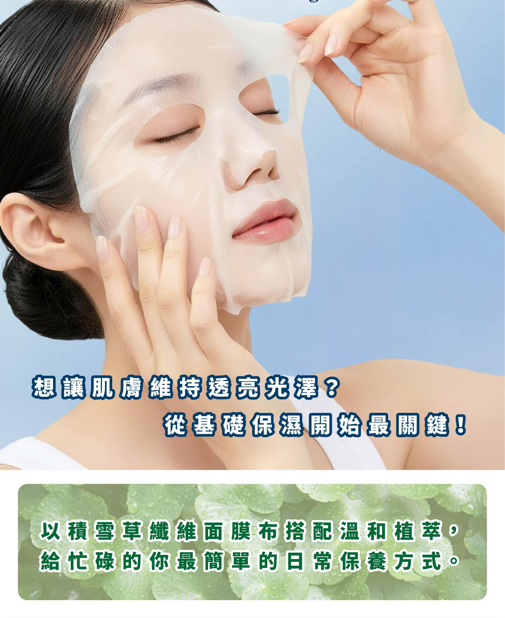 用途:採用安全環保的積雪草纖維面膜布,夏威夷海藻膠搭配小黃瓜萃取等水嫩成分,深入肌底,紓緩乾燥與粗糙肌膚,重拾健康水嫩彈性。