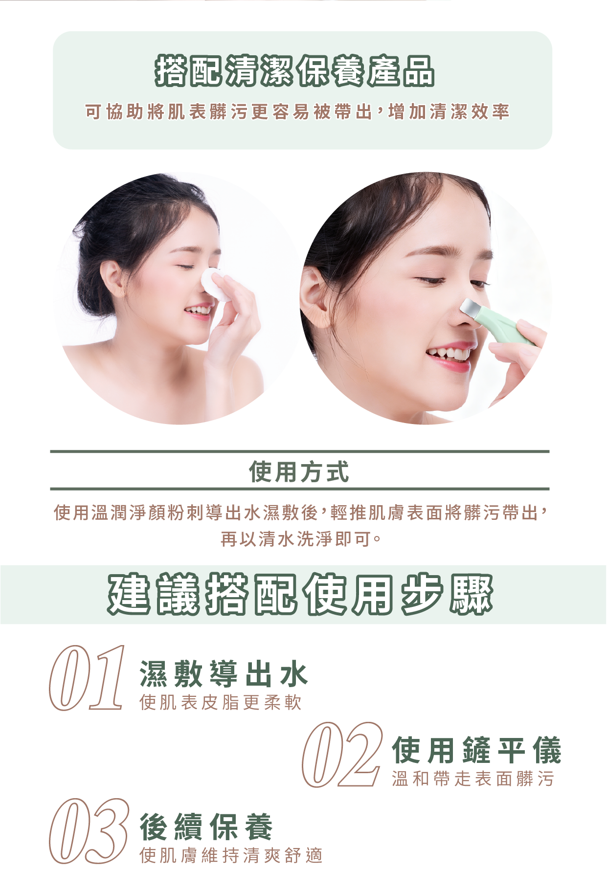 用法:溫潤淨顏粉刺導出水後使用,輕推將粉刺去除,並用清水洗淨。