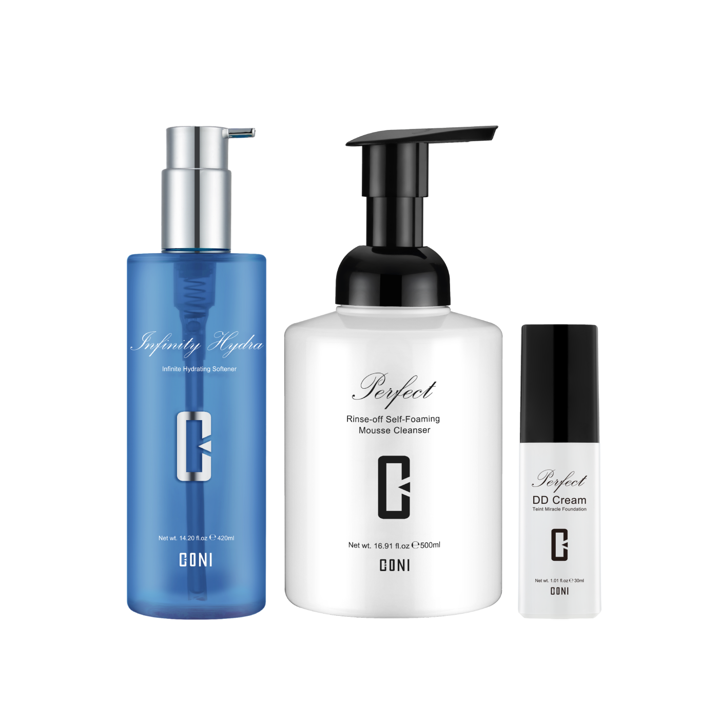 美妍保濕雙效潔顏幕絲500ml+奇肌裸光精萃水粉霜30ml+無限肌緻活齡潤膚水420ml